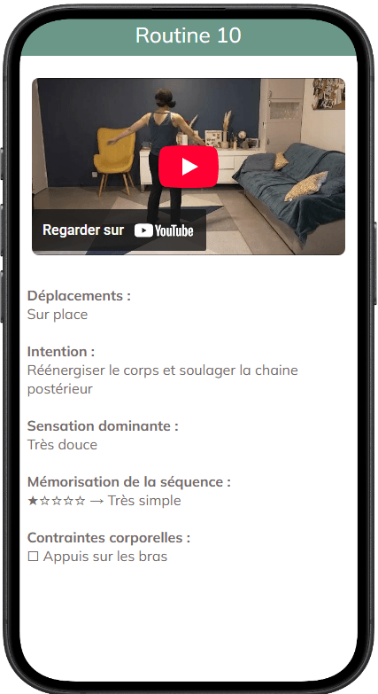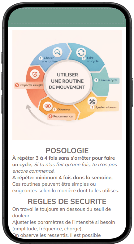 Vous aurez accès, via l'application, à une banque de routine de mouvements ainsi que des compléments de contenus pour adapter au mieux la pratique chez soi.